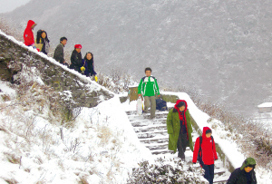 本报讯 冰冷的冬雨,瑟瑟的寒风,4日至5日,受强冷空气影响,巫山、石柱、涪陵、城口、黔江、武隆、南川等区县都飘起了雪花。而金佛山和仙女山已是白雪皑皑,积雪厚度达10厘米以上。