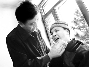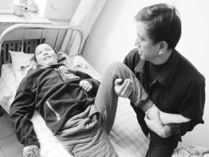 下午是按摩时间。郭培寿用那双粗大的、干惯农活的双手在儿子脸上捏了捏,儿子立即咧开嘴,“啊啊”叫了起来。