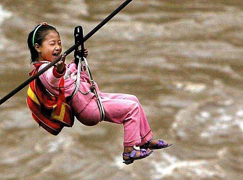 云南怒江边傈僳族读三年级的余春花和余才妹姐俩滑索过江上学。(图片来自:新京报)