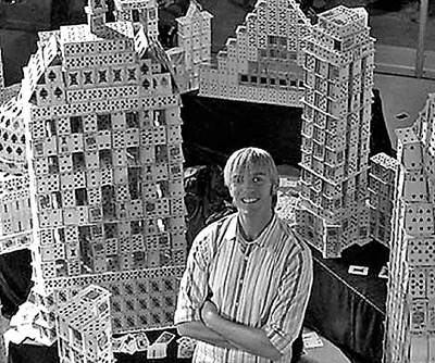 据悉,布赖恩的“扑克牌建筑”已经屡屡创下了吉尼斯世界纪录,1992年,当时18岁的他刚刚从中学毕业,就用扑克牌搭建出了一座4.4米高的“摩天楼”,从而创下了“世界最高扑克牌建筑”的吉尼斯纪录,这也是布赖恩获得的第一个世界纪录。并且15年来,他都是这一世界纪录的保持者。