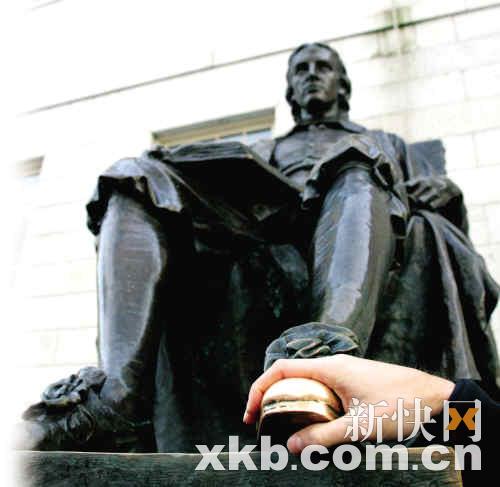 据新华社电 12月8日,在位于美国波士顿的哈佛大学,一名游客在触摸约翰·哈佛铜像的左脚。哈佛大学是以它的第一位赞助人——约翰·哈佛的名字命名的,约翰·哈佛铜像是校园里最著名的地标,每天都会迎来络绎不绝的参观者。由于传说触摸铜像的左脚会带来好运,所以慕名而来的游客都会使劲摸一把,期望自己或者子女有朝一日能考上哈佛大学。久而久之,这只左脚在世界各国游客的“偏爱”之下被摸得铮明瓦亮,相比之下,无人眷顾的右脚则显得“黯然失色”。