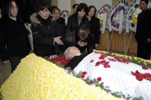 11月16日,国际著名发育生物学家、美籍学者、爱国人士、美国坦普尔大学终身教授、中国科学院研究生院博士生导师、中研院院士牛满江教授遗体告别仪式在北京八宝山革命公墓举行,牛满江教授的夫人张葆英及亲属与他进行最后的告别。牛满江教授因病经抢救无效,于11月8日凌晨在北京逝世,享年95岁。中新社发 徐曦弋 摄