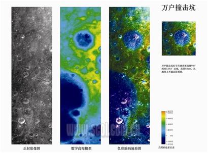 绕月探测工程地面应用系统总设计师李春来说,月球背面图中的一张是月球背面Lents撞击坑附近一个典型的辐射线撞击坑,坑缘直径约30km,是一种辐射型的撞击坑,它位于月球背面西经100度左右,这种撞击坑在月球背面非常多。辐射线撞击坑是在天体撞击月球表面后,月球表面的物质向外抛射形成一个辐射型月球地貌。而另一个撞击坑是以中国明代官员万户命名的撞击坑,位于月球背面南纬9.8度西经138.8度区域,直径52km,从地球上不能直接看到,它的直径有52公里。