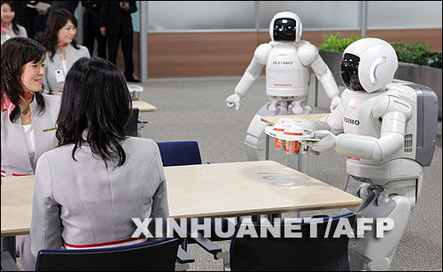 12月11日,在日本东京的本田公司总部,两台“阿西莫”机器人服务员为公司员工送茶。