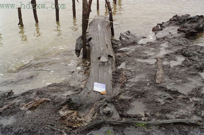 它与晋江深沪湾海底古森林遗迹一棵棵独立的针叶林树桩不同,这是片阔叶林,年代应该更久远。调查发现,除了海里,岸边晒池的养虾池底部也发现了最大的一株古木,胸径达到2.1米,这说明这片古森林的分布面积较广,埋藏较深。