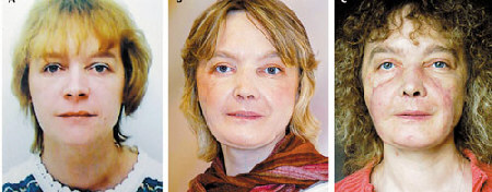 上图:迪努瓦尔不同时期的照片:2001年6月,被狗咬伤前4年的照片(左);2006年11月,换脸手术一年后的照片(中,有化妆);换脸手术18个月后面带微笑的照片(右,没化妆)