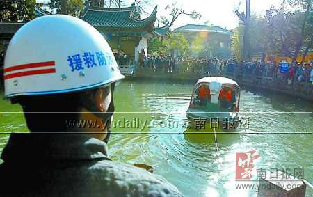下午4时30分,记者离开前,公园正在召开紧急会议,研讨打捞方案。截至到当晚7时,带着潜水装备的打捞人员还在现场打捞。