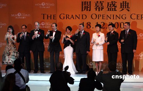 十二月十八日晚,澳门美高梅金殿MGM在新口岸隆重开幕,澳门特首何厚铧(右四)、澳门赌王何鸿燊〔左四〕、美高梅金殿MGM总经理何超琼〔右五〕(何鸿燊长女)与董事何超凤〔左一〕(何鸿燊与二姨太之女)等出席典礼。至此,澳门六个赌牌已投入市场,博彩业市场竞争进入白热化。中新社发 武仲林 摄