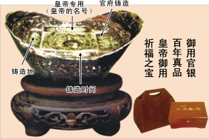 北京故宫博物院以及北京市文物局的大力支持下,这套藏品中,收藏了清朝光绪年间,宣统年间皇帝支配使用的御用官银,是世上罕见的大元宝,距今已有百年,重50两,约2公斤,它是真正的文物古董,是可遇而不可求的,它有北京市公证处的公证书,还有权威部门的鉴定书,这次在广州地区销售30套。