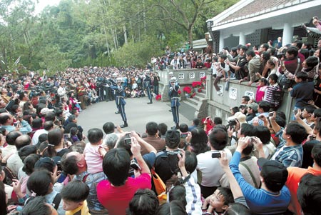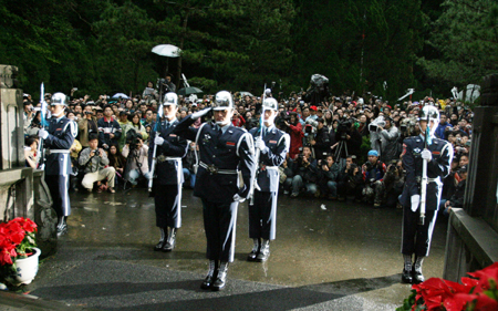 两蒋陵寝12月24日起暂停对外开放,驻守的军队将在明年元旦撤哨,23日为开放的最后一天,许多民众高举相机拍下历史画面。(图片来源:台湾《中国时报》)