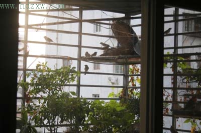 老杨夫妇还很注重麻雀们的用餐环境,两老把两个水果竹篮子扣在一起,垒个麻雀窝,再放上塑料餐盘子放米。为了避免老鼠偷袭麻雀餐厅,两老把麻雀窝高高吊在阳台半空,底下放几盆绿叶盆栽衬托,唐婆婆很有情趣地说:“有了绿色植物再加上竹窝,才像个小鸟吃饭的地方啊。”