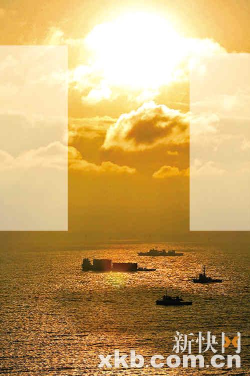 运载着“南海I号”沉箱的船队在阳光照耀下金光闪闪,十分壮观。“重任1601”号正在边防巡逻艇、海事船和拖轮组成的大船队中间缓缓开动,上面的红棕色沉箱分外显眼。