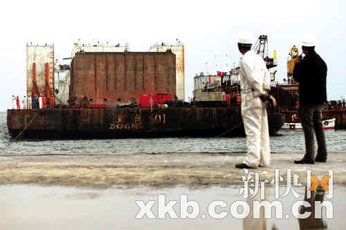 昨天傍晚,托着“南海I号”沉箱的半潜驳船“重任1601”号的缆绳绑在了临时码头上,“南海I号”沉箱清晰可见,随时可以完全靠岸。