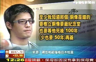 蒋友柏还认为中正纪念堂树立蒋介石铜像是错的,要树立铜像要盖纪念堂,也要等他过世后100年至少也要50年,“人民想替你盖,才叫真伟大”。