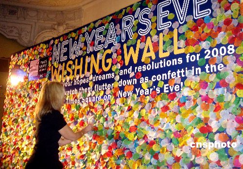 图:纽约“许愿墙”写满新年祝福 中国新闻网 中国新闻网官方账号 2007.12.2909:46 关注 新年临近,纽约时代广场的“许愿墙”(wishing wall)上贴满了人们写下的新年愿望。这些写在彩纸上的祝愿将在新年来临的那一刻,随着时代广场上的水晶球一起飘向空中。中新社发 谭宏伟 摄