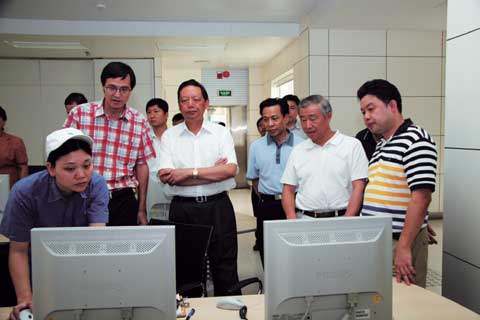 周昌贡总经理(右二)陪同国家烟草专卖局局长姜成康(中)考察公司技术中心