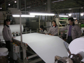 尤为值得一提的是,这家公司生产的合成革产品耐水性和耐磨性大为提高,在成本和有关品质方面皆优于天然皮革产品。技术人员介绍说,这种新型产品即便浸水24小时都不会变形,并且耐磨性也更高,适于制作运动鞋和足球等延伸产品,确保了延伸产品的适用场合更为广泛。图为合成革生产场景。(记者尼松义文/摄)