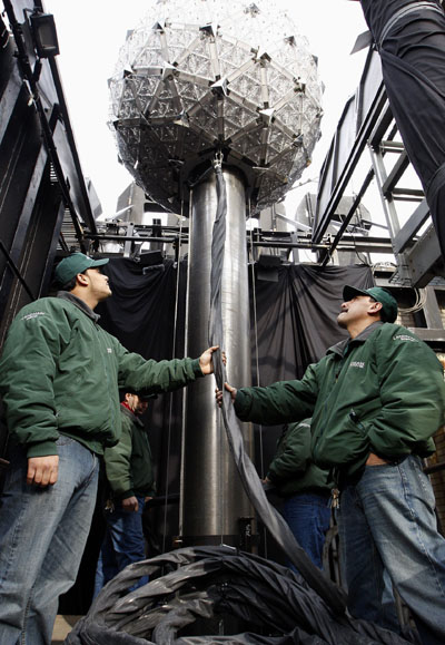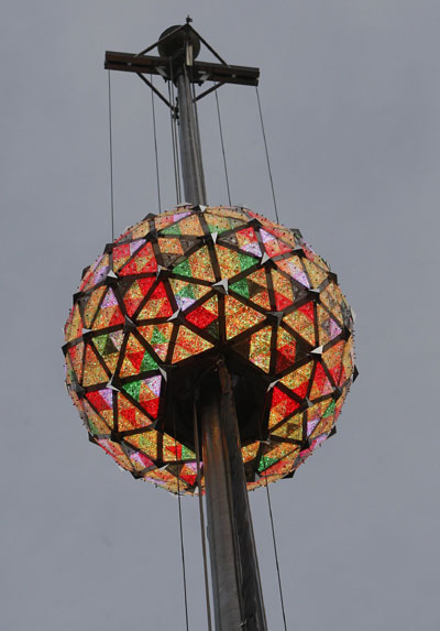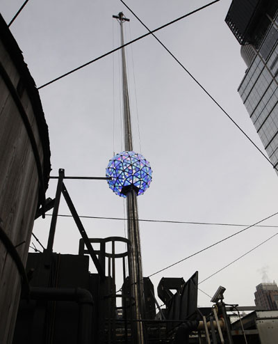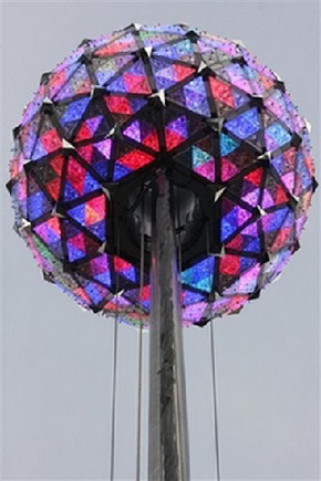 中国日报网环球在线消息:纽约时代广场新年之夜巨形水晶彩球今年将迎来其100岁“生日”。在今年的新年前夜,这颗彩球将以节能环保的崭新形象出现在人们眼前。与往年不同,菲利普照明公司今年专门为彩球设计了9576只节能灯泡,这些灯泡所耗费的电能仅相当于10个烤面包机,但是其亮度却相当于去年的两倍,透过彩球外壳的水晶三角装饰,人们可以看到彩球变换出超过1600万种色彩。