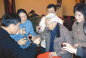 照片展示结束,雷鸣般的掌声响起,一位客人抑制不住内心激动,走上舞台领唱起了《感恩的心》:“我来自偶然/像一粒尘土……感恩的心/感谢命运/花开花落/我依然会珍惜……”随后,客人们相继登台献唱祝寿,更有人现场泼墨书“寿”字庆祝。李宗岱大儿李大淮及长孙李沁等,感动得泣不成声。他们称,老人一生节俭,连掉在桌子、衣服上的饭都要捡拾干净(老人右脸负伤失去知觉,吃饭时常掉饭粒)。此次寿诞,老人反复强调:不张扬、不铺张,并专门打招呼,不准送礼。因此,只办了10桌,邀请的大多是亲属和个别好友,但许多朋友不请自来。本报记者 韩毅 报道摄影