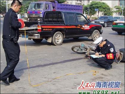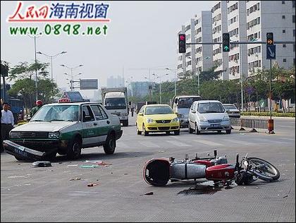 1月7日下午约2时,海口滨涯路与海垦路交汇处发生车祸,一辆无牌摩托车闯红灯时被一辆横向行驶的出租车撞飞,摩托车司机身受重伤。