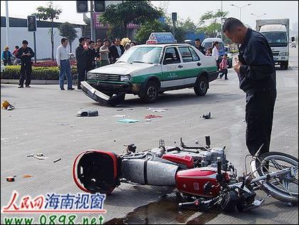 海口滨涯路:无牌摩托车被出租车撞飞[图]