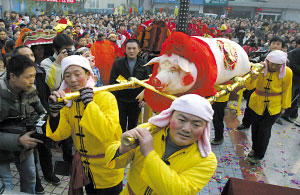 昨日,渝北五宝镇广场,几名男子将穿着花衣、打上腮红的年猪扛上舞台