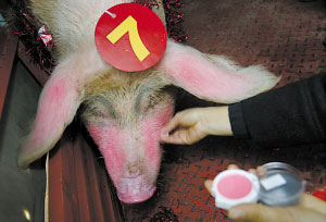 昨日早上10点过,一辆专车将比赛的肥猪送到五宝镇广场附近。家住下湾村的李强正拿着一盒腮红,往自己的参赛年猪“飞雪无双”脸上抹,猪儿却不肯配合,四处窜来窜去。