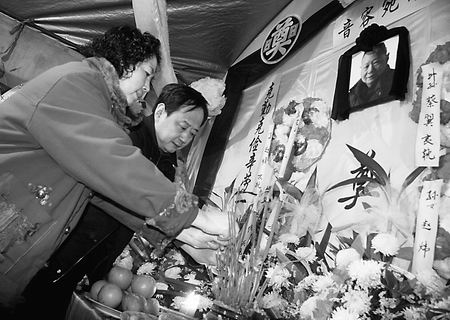 晚饭后,众多热衷川剧的“玩友”聚集在灵堂中,摆放好小鼓、堂鼓、大锣、大钵、小锣等传统打击乐器,然后围坐在灵堂中,在鼓师指挥下,最后一次为赵老表演川剧打围鼓。在震耳的锣鼓声中,不少悼念者流出了热泪。