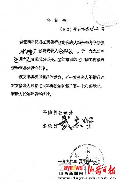 2006年3月3日,当赵秋云接到运城市中级人民法院的执行通知书时,他才知道法院是根据史安国提供的一份(92)平证字第412号公证书(标的为114.55万元),按照简易程序进行执行的。从法院依据的这份公证书上,赵秋云发现,原本打印的公证书上却被人手写补充了一句:“从88年以来所有借款合同。”这样一改,原本4万元的借贷款便成了114.55万元。赵秋云认为这份公证书有问题,便向法院提出了执行异议,同时向平陆县公证处进行了举报。该公证处对公证案卷进行了核查,并向运城市中级人民法院出具了证明:原公证文书上确无“从88年以来所有借款合同”字样。