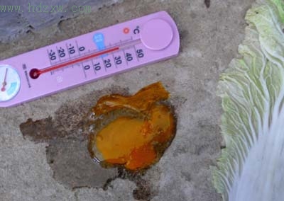 厨房“发烧”的地方就是在门后靠墙的水泥地面,记者试了一下,只要手指一接触地面,就可明显感觉到热气。老陈拿来温度计一测,显示的温度是40℃。记者随后找来一个鸡蛋打碎放在地上,又拿了片新鲜的蔬菜叶放在地上,没一会儿,鸡蛋边沿就卷了起来,菜叶也蔫了。