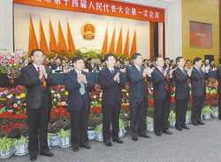 在热烈的掌声中,选举产生的新一届市人大常委会、市人民政府、市中级人民法院、市人民检察院领导人员与代表们见面。