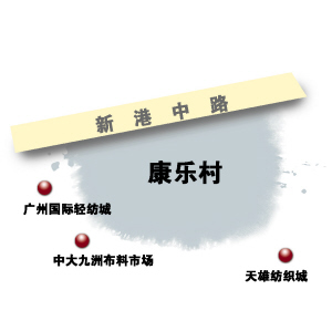 依靠康乐村位于新港西路的广州中大纺织品商圈经过近20年的发展,现在已形成了约30个分市场,6000余家商户,年成交额逾200亿人民币的纺织品批发市场群,成为广东省乃至华南地区最重要的纺织品资源采购地和集散地,也是全国最重要的纺织品专业批发市场之一。