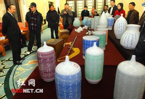 红网长沙1月14日讯(记者 汤红辉 摄影 明健飞 实习生 何玉娟 姜雄)今日上午,受第十届全国人大常委会副委员长李铁映同志之托,李铁映秘书李韧向家乡的湖南省博物馆捐赠了一批极具收藏价值的作品,其中包括15件李维汉革命生平瓷器作品、《大学笔记》影印件一套16本,以及李铁映制龙泉宝剑“李维汉剑”一把。