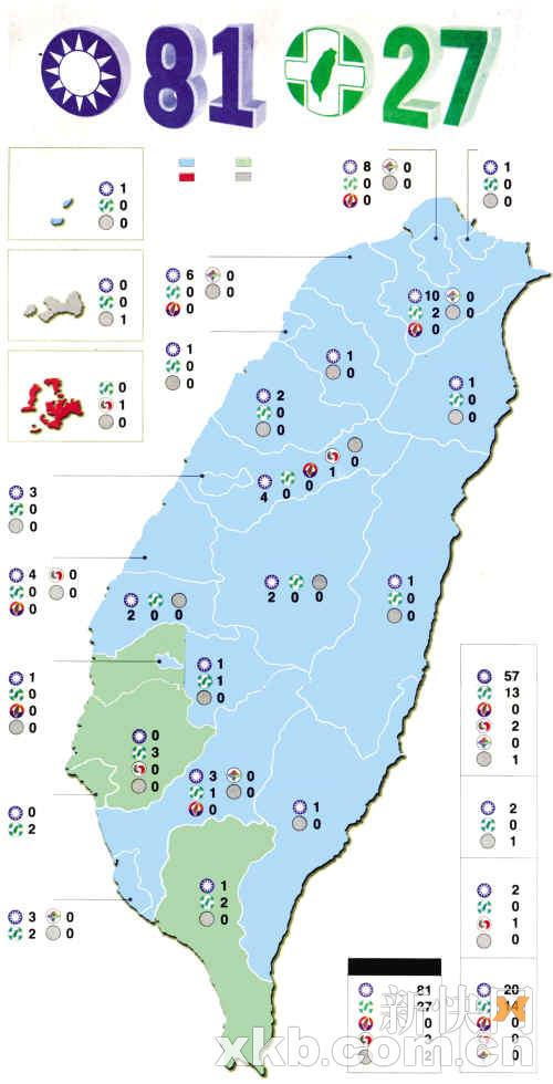选情方面,国民党在北部与中部,除了台北县失掉两席外,各县市都以全垒打出。传统绿油油的南部22席,国民党一口气攻下11席过半席次,除了台南县市5席全军皆墨外,云嘉与高屏五县市都拿下佳绩,可以说已经打破“北蓝南绿”的政治版图。