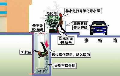 郑先生在人行道上久候不见林小姐,唤了数声也未听见应答,于是翻上离地面几十厘米高的绿化带察看,没找着林小姐,却发现绿化带后面是一条长长的深沟。