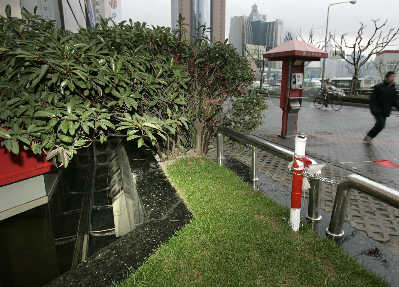 汤臣金融大厦位于浦东新区东方路710号,昨日,早报记者看到,在大厦裙楼北侧的玻璃幕墙前,约1米宽的绿化带隔开了大楼和张杨路的人行道,绿化带不锈钢围栏上挂着一块“不得入内,后果自负”的警示牌。