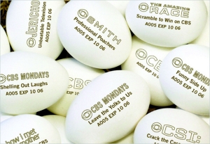 除了传统的媒体广告形式,商家还使出各种营销手段,吸引消费者的眼球,用最小的成本做最大的宣传。去年,美国哥伦比亚广播公司为一档节目做的推广就很“别开生面”。他们把要播出的电视节目,用烫金的字“印刻”在白壳鸡蛋上,然后在全美大型超市里同一时间“上市”。当主妇们买鸡蛋时就把节目名字一块捎回家了,做一次饭、摸一次鸡蛋就得注意一下这个节目。