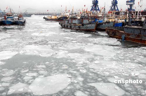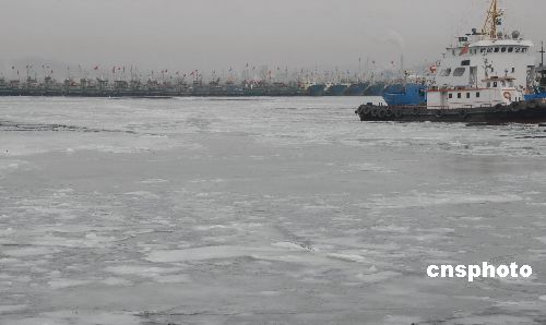 图为1月17日,大连港黑嘴子码头大面积结冰。受冷空气影响,大连持续低温,北部渤海海域旅顺北海、夏家河、棋盘磨、毛莹子、金州龙王庙一带沿岸海域先期封冻,1月16日,属黄海海域的大连港口大面积结冰,系近年罕见,但港口航运未受影响。中新社发 王锡增 摄