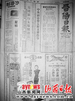这份《晋阳日报》的一、四版全部为广告。一版主要是中华书局的特价书、亨得利公司的钟表眼镜、新加坡虎标永安堂的万金油以及银行、商行、学校的广告。四版主要是药品广告、律师启事、寻人启事和讣告。有一则西北实业公司的《煤价从新规定》广告较有价值。西北实业公司是1933年8月1日由阎锡山创办的以民办方式统管山西工业的公司,是山西创设的各项工矿企业的总管理机构和工业方面的总枢纽,也是山西最大的官僚资本之一,在近代山西工业史中占有重要地位。广告中标明,块煤每吨五元,筛煤每吨四元三角,混煤每吨二元八角,末煤每吨二元一角;运价每吨五角,半吨三角。该广告对研究山西的煤炭经营史具有一定的史料价值。