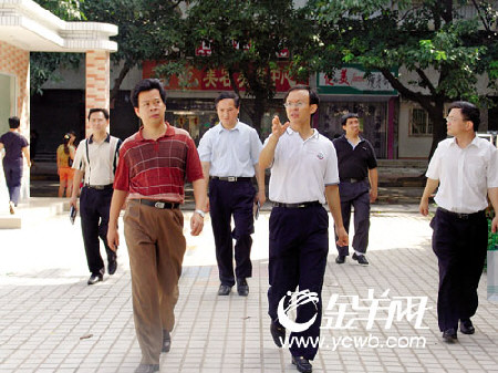 上图:包强平校长(中)向宝安区教育局局长郑映通(左一)汇报工作