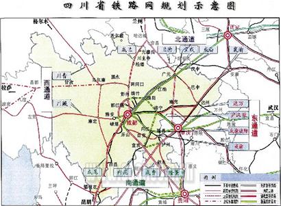 “以世界眼光审视四川,又会有全新发现。”解洪翻开 《四川省铁路网规划示意图》(见图例),四川下连东南亚,上牵欧亚大陆,是东盟-中国-欧洲各国的重要通道。新规划的成都至甘肃哈达铺线直通兰州方向,成都至江油延伸至西安客运专线直通北京方向,等于打通了面向欧亚大陆的北通道;新规划的成都至贵阳铁路,用意更明确:打通南通道,与北部湾、珠三角地区,乃至东南亚联系。