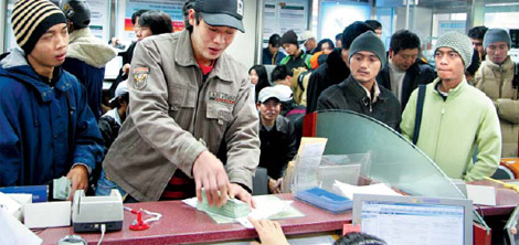 元谷洞银行每到周日就挤满了往祖国汇款的外国劳动者。(金平和/摄)
