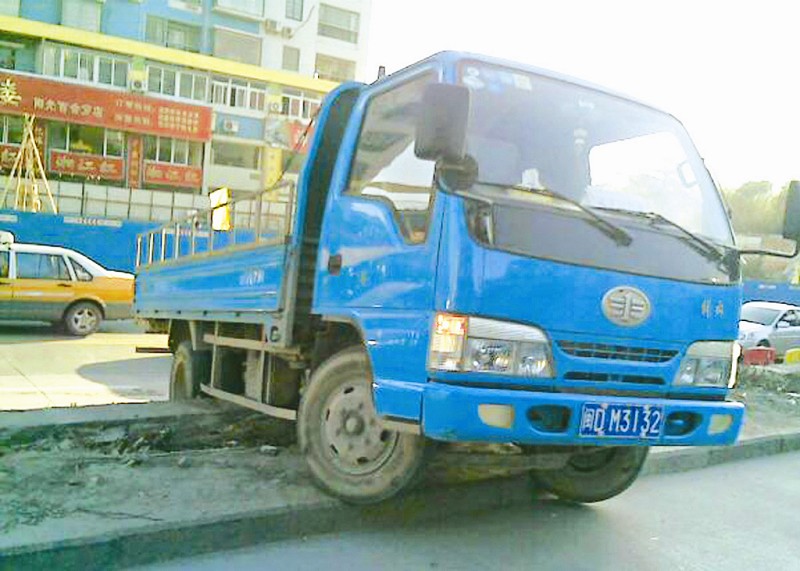 莲前西:货车“腹部”卡在凸出的石条上