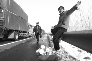 1月21日,合徐高速安徽蚌埠段,受堵的车辆排起了长龙。合(合肥)徐(徐州)高速安徽蚌埠段受大雪影响,从1月20日开始,先后造成几公里长的汽车受堵,至1月21日中午12时20分左右,交通基本恢复正常。图为村民在受堵的车辆中间叫卖方便面。谢正义/摄