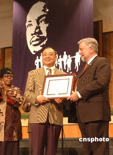 当地时间一月二十一日,美国俄勒冈州华人联合会会长曹国强(中),在马丁.路德金纪念日,荣获美国波特兰市市长汤姆.波特颁发的“终身成就奖”,以表彰他对美中文化、经贸、社会所做的杰出贡献。中新社发 贾国荣 摄