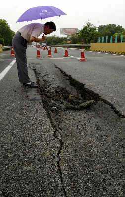2006年7月5日,沪嘉高速公路南黄泥泾桥主车道中跨板梁因扭曲过度,导致部分路面发生塌陷。赵昀早报资料