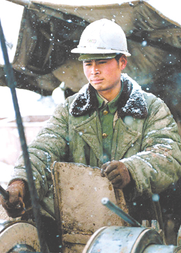 1996年春节刚过,几十年不遇的寒流突袭西海固地区,气温降到零下20多度,钻机旁的泥水结成一层冰。正在这里打井的官兵在冰上作业常常滑倒在钻台上,有的干脆在鞋底上钉上橡皮钉或是绑上草绳。戴着手套操作的战士,不一会儿手套与钻杆冻在一起,要用热水浇化才能拿下来。