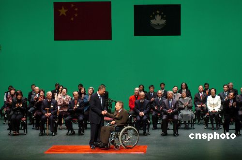 一月二十五日,“二零零七年度澳门勋章、奖章和奖状颁授仪式”在澳门文化中心举行,澳门特首何厚铧为四十二位个人及团体颁授勋章、奖章和奖状,以表彰他们在个人成就、社会贡献或服务澳门特别行政区方面作出的杰出贡献。图为何厚铧为王守基颁授工商功绩勋章。中新社发 史利 摄