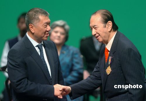 一月二十五日,澳门特首何厚铧将澳门特区政府颁授的最高荣誉勋章——-大莲花荣誉勋章授予澳门博彩股份有限公司行政总裁何鸿燊博士。当日,“二零零七年度勋章、奖章和奖状颁授仪式”在澳门文化中心举行,四十二位个人及团体获奖,以表彰他们在个人成就、社会贡献或服务澳门特别行政区方面作出的杰出贡献。中新社发 史利 摄