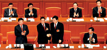 市委书记刘淇向新当选的北京市市长郭金龙表示祝贺。晨报记者 殷楠/摄